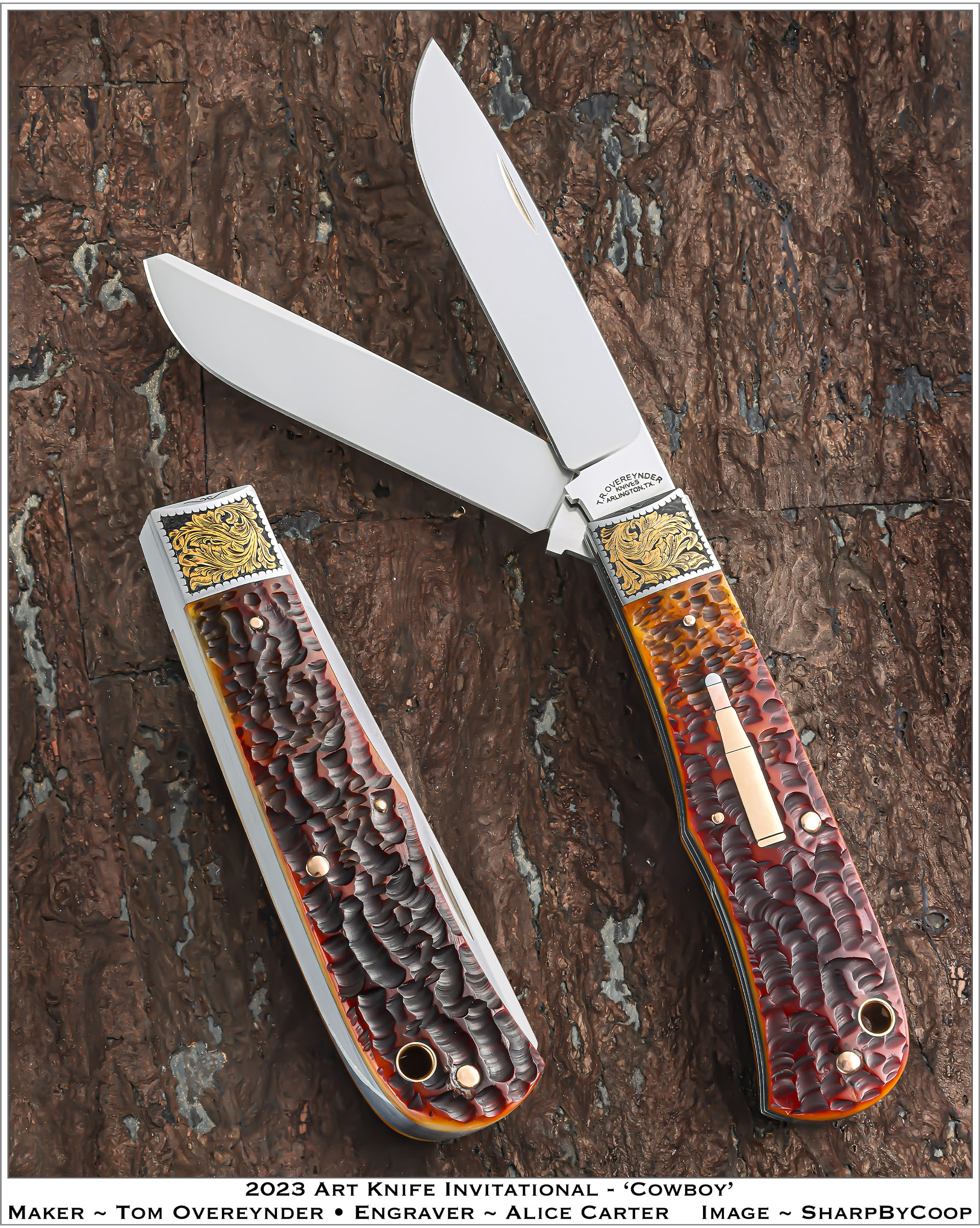 Based on an old traditional pattern that was made by several of the knife companies. I call it my M-42 and it is SN 004.The Remington knife company called it a 1123 Remington bullet.This 2 bladed design is called a flush joint due to the unique feature that the blade tangs are flush to the front end of the bolsters in the closed and half stop positions, which is a challenging accomplishment. The blade has PSF-27 steel, the 416 stainless frame is an integral bolster liner, the covers are jagged bone. The bullet is red gold and yellow gold, the pins and thong hole liner are rose and yellow gold. The classy engraving and gold inlay was done by the talented Alice Carter in American scrollwork done in 24K gold, the background is relieved and stippled. A western nicked border surrounds the design.